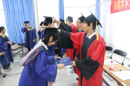 随后,学位授予仪式正式开始,在场毕业生依次上台接受导师拨穗并一同合影留念。