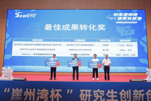 刘谦教授团队的《瑞禾智影-基于定制化CT的作物4D表型智能解析技术》(队长:卢宇韦 队员:梁恒、徐栋、刘琪、余丽、裴双康、卢震、罗颖 指导老师:刘谦、余乐俊)介绍了一种新型智能作物4D表型解析技术,获特等奖—带动就业奖;殷明教授团队的《Briareus——新型智能肌电仿生手》(队长:郭城 队员:庞思琪、卢浩、王永欢、魏双莹(本科))介绍了一种新型智能仿生手,获特等奖—最佳成果转化奖;朱明强教授团队的《AIE水凝胶抗菌复合材料的产业化》(队长:唐玉娇 队员:蔡益、蔡於兼、王彩云、张露 指导老师:王亚龙)获三等奖。其中,特等奖项目被推荐参加2023年海南自贸港创业大赛青年人才邀请赛决赛,并获得了30万元创业奖金支持。