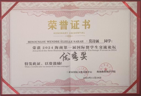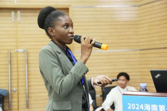 布基纳法索籍留学生莫诗涵(MINOUNGOU WENDBE ELIELLE SARAH)凭借精彩的演讲“Hainan, an Eldorado at the heart of global trade”,荣获优秀奖。在演讲中,她结合自身学习与生活经历,从一名国际学生的角度分析了海南自贸港政策对全球合作和文化融合的推动作用。