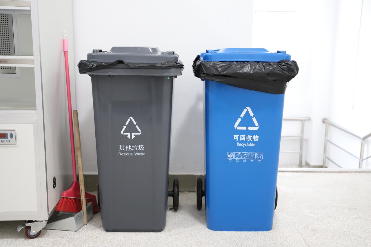 (二)各区域使用蓝色、灰色、红色来区分可回收垃圾、其他垃圾、有害垃圾、厨余垃圾,所有人员将垃圾按分类投放到相应的垃圾桶。