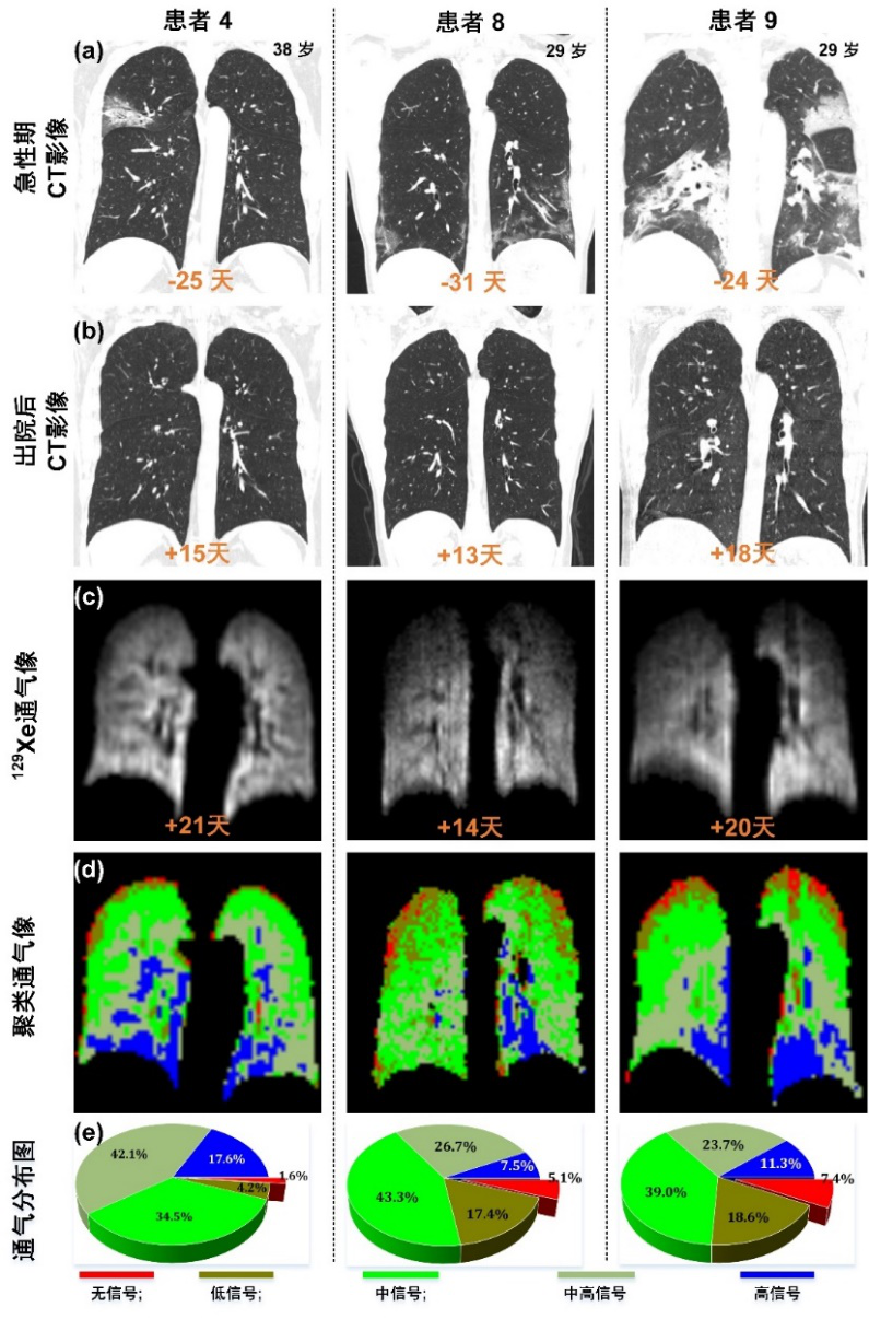 (a)肺炎急性期时肺部CT图像;(b)出院后的肺部CT图像;(c)肺部气体MRI影像;(d)通气功能聚类(k-means map)图像;(e)不同通气功能占比