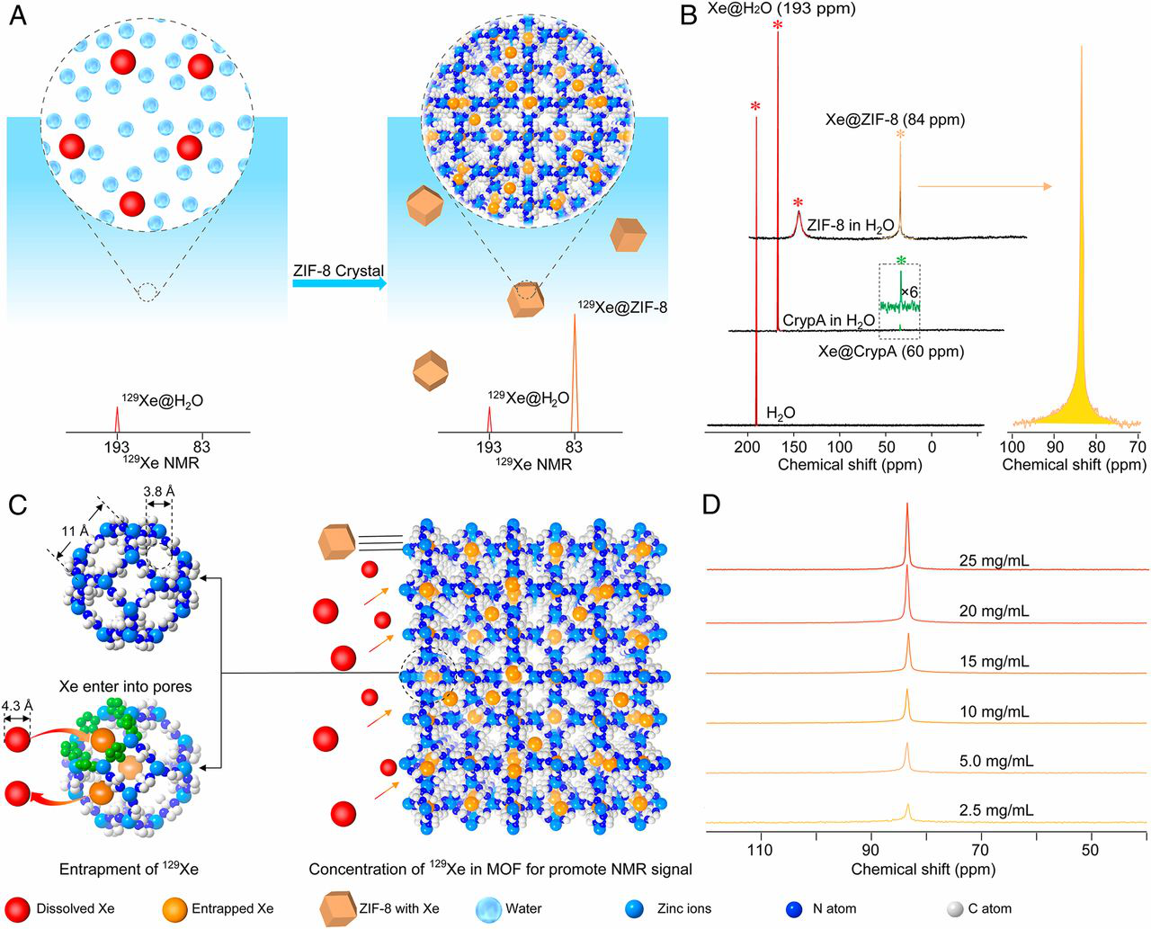 科研团队首次提出水稳定性的金属有机骨架材料(MOF)——ZIF-8作为129Xe的纳米“笼”来装载129Xe,能有效提高水溶液中“笼”内129Xe的浓度,利用课题组自主研制的超极化气体磁共振科学仪器,显著增强了水溶液中“笼”内129Xe的磁共振信号,比传统分子“笼”内129Xe的磁共振信号提高了200倍,实现了超极化129Xe磁共振分子影像领域的重要突破。进一步,由于突破了“笼”内Xe信号强度的壁垒,可在生物检测中利用该信号与血液中信号之间的化学交换,放大血液中的微弱信号,从而提升血液中分子探测的灵敏度。该方法被命名为“Hyperpolarized Xe Signal Advancement by Metal-organic framework Entrapment (Hyper-SAME)”。Hyper-SAME可与作者之前发明的Hyper-SAGE技术(PNAS, 2009)相结合,进一步优化、放大129Xe的磁共振信号。这项研究显著提高了水溶液中气体磁共振的灵敏度和分辨率,代表着气体磁共振作为生物医学主要工具向着高灵敏靶向检测迈进了一大步,相关研究结果发表在美国科学院院刊(PNAS)上。
