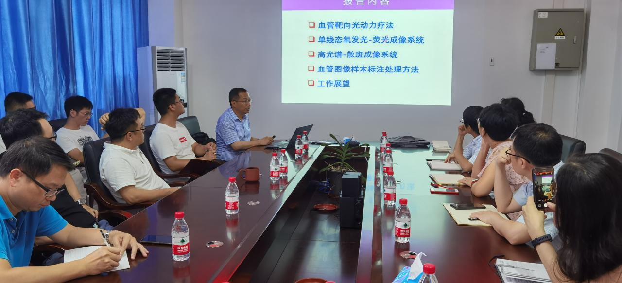 做学术交流,学术报告会由刘谦院长主持。首先李教授做了《多模光学成像技术定量监测光动力血管损伤》的学术报告,报告后小宝影院