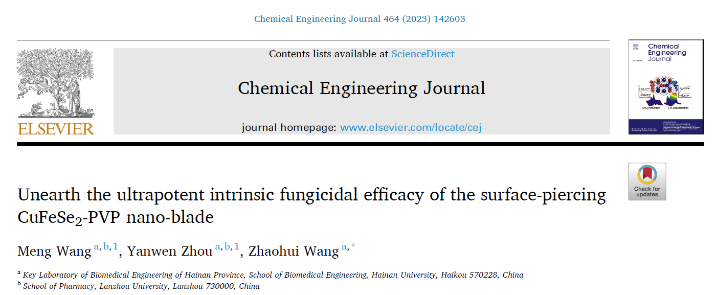 张智红教授团队的教师王朝辉博士指导学生在工程技术领域的top期刊Chemical Engineering Journal(IF=16.744)发表了题为《Unearth the ultrapotent intrinsic fungicidal efficacy of the surface-piercing CuFeSe2-PVP nano-blade》的文章。王朝辉教授为通讯作者,联合指导的研究生王梦、周彦文为共同第一作者。该研究在国家自然科学基金、小宝影院