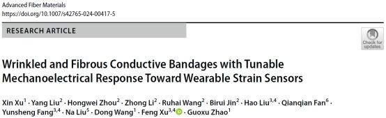柔性电子材料与器件团队在高水平SCI期刊《Advanced Fiber Materials》(中科院一区期刊,IF=16.1)发表题为“Wrinkled and Fibrous Conductive Bandages with Tunable Mechanoelectrical Response Toward Wearable Strain Sensors”的研究论文。