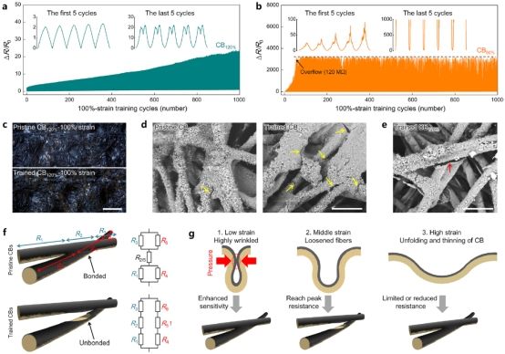 通过应变锻炼(通常仅需单次应变)在导电层中诱导形成裂缝,是构建高灵敏电阻式应变传感器的常用策略。本工作发现,应变锻炼会较为缓慢且可控地增强CBs的应变传感灵敏度,并且这种锻炼效果能够通过锻炼应变量和CBs预拉伸应变量进行调节(图3a-b)。经证明,这种现象是由于褶皱结构CBs在应变锻炼过程中主要发生弯曲形变,而非拉伸形变,因此覆盖在自粘绷带无纺纤维上的导电层并未出现裂缝或脱落。取而代之,应变锻炼主要作用于被碳纳米管导电层粘合的相邻纤维搭接位置,使CBs的表层固结纤维逐渐恢复为对应变信号更为敏感的蓬松纤维状态,以此实现可控的灵敏度增强效果(图3c-e)。上述褶皱和纤维结构介导的两种应变传感机制能够协同作用(图3f-g),使CBs对微小应变信号表现出高灵敏度。