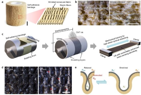 相较于从无到有研发WSSs,采用低成本商用柔性材料作为WSSs的柔性基底,并建立能够合理利用其优点的导电修饰方法,有望兼顾WSSs的优异性能和低成本。以此为设计理念,本工作选择在医疗和运动领域中得到广泛应用的自粘绷带作为柔性基底,通过静电喷涂碳纳米管导电层,制备得到了褶皱和纤维结构导电绷带(CBs)。借助自粘绷带的高度褶皱结构(图2a),在喷涂过程中对其施加不同程度的预拉伸,使褶皱谷以不同程度暴露(图2b-c),从而能够调控碳纳米管层在自粘绷带上的空间分布(图2d)。并且,发现并利用了褶皱侧壁接触-分离过程所介导的电阻式应变传感机制(图2e),其效能与碳纳米管层的非均匀分布程度具有正相关性,这使得能够通过褶皱结构来调控CBs的应变传感性能。
