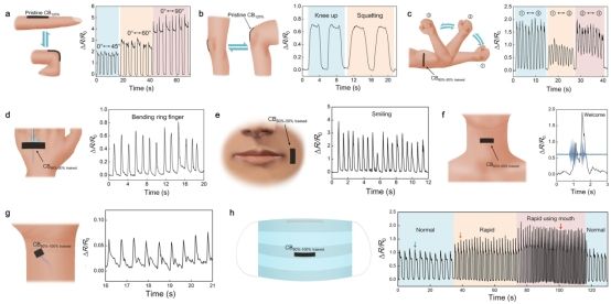 褶皱和纤维结构介导的上述两种性能调控途径在单独或协同进行时,能够便捷且按需设计CBs的应变传感性能,因此制备了具有不同传感性能的WSSs,并展示了其对手指关节活动(图4a)、膝关节活动(图4b)、骨骼肌收缩活动(图4c)、输液位点表皮应变(图4d)、人脸微表情(图4e)、喉部活动(发音或吞咽,图4f)、脉搏(图4g)和呼吸(图4h)等大幅度至轻微的人体全范围应变信号的精确且实时监测能力,证明了CBs用作WSSs的巨大应用潜力。